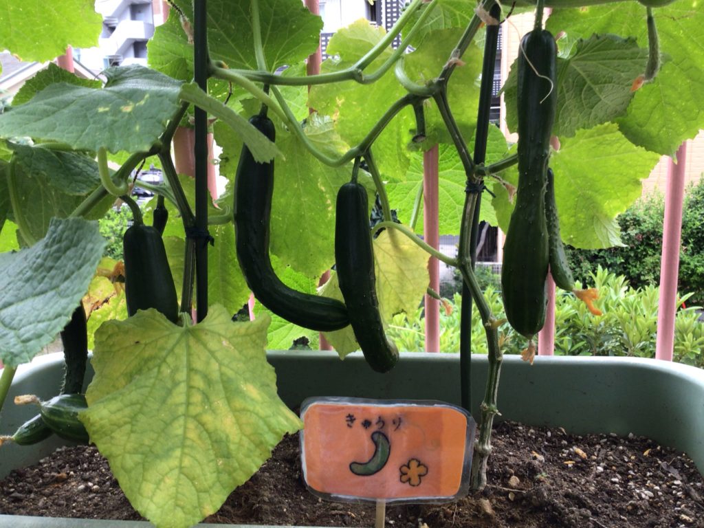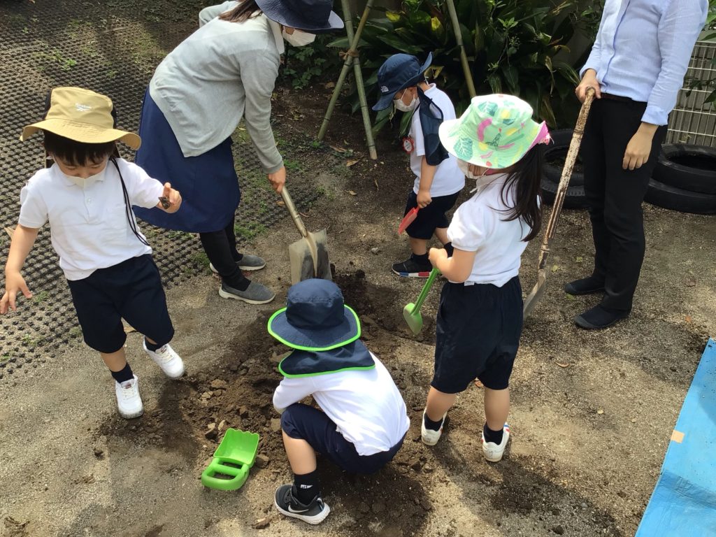 5月に全園児が総出で土づくりと畑づくりをし、野菜の苗を植えました。キュウリやピーマンなど、収穫が始まった野菜もあります。年少児は早速、キュウリを塩もみにして頂きました。